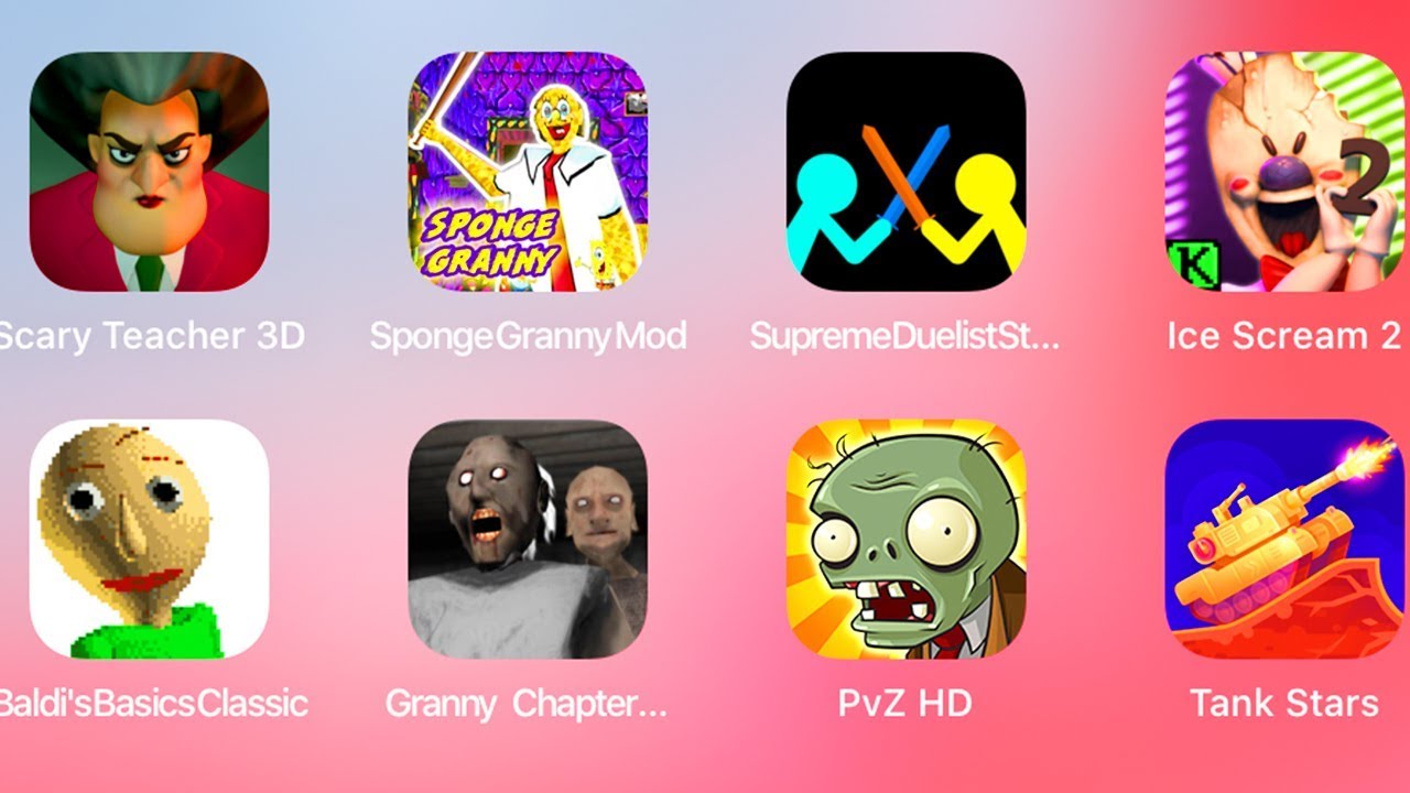 Scary Teacher,Granny Sponge,Supreme Duelist Stickman,Ice Scream 2,Baldis Basic Classic,Granny Two,PvZ,Tank Stars,Plants vs Zombies,