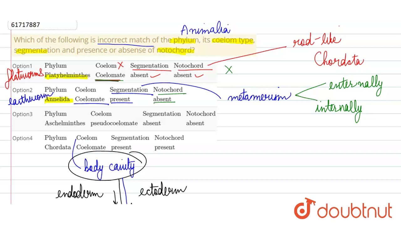 Which of the following is incorrect match of the phylum, its coelom type, segmentation and presence or absense of notochord?