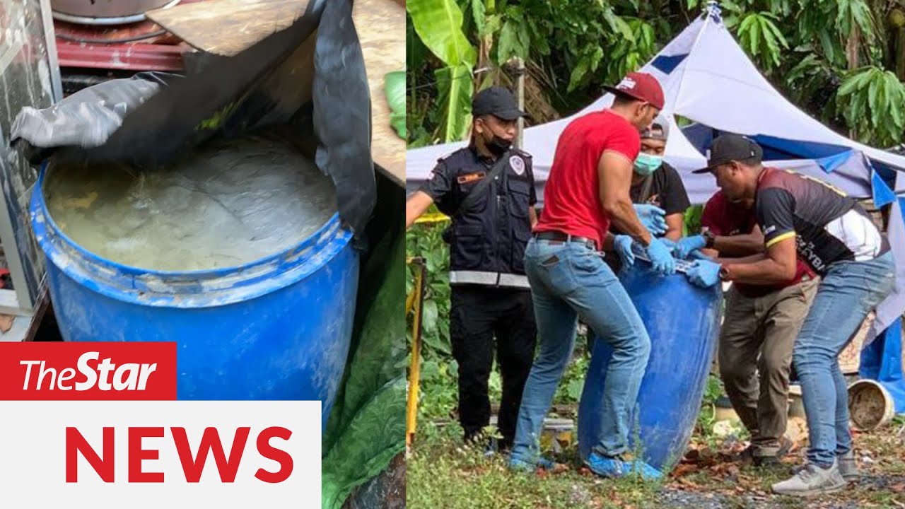 The body of a man believed to have been killed by his younger brother was found in a blue plastic barrel filled with concrete behind their house in Kampung Padang Hassan, Alor Setar, Kedah on Sunday. ------------------------------------------